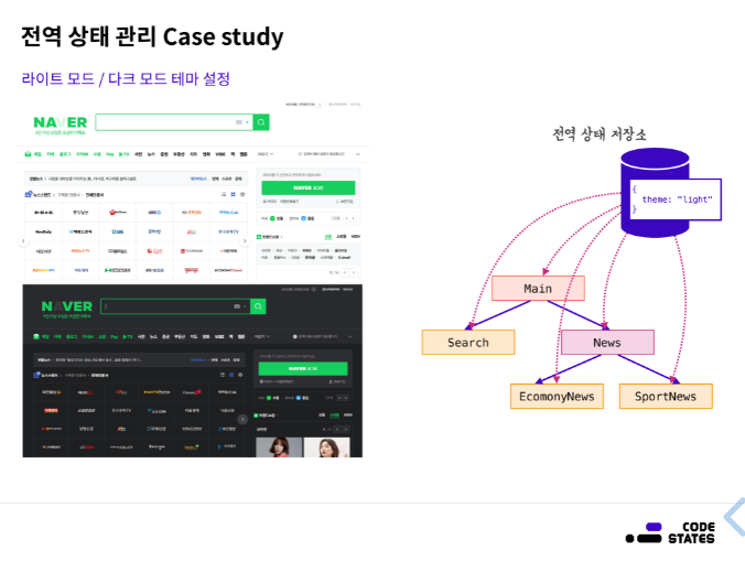 전역 상태는 다른 컴포넌트와 상태를 공유하고 영향을 끼치는 상태임.